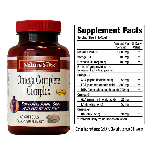 American already get plenty of Omega 9 and Omega 12 in their diets, it is the Omega 3’s and 6’s which have low dietary intake. Two of these “Alpha Linolenic acid” and “Linoleic acid” are referred to as “essential fatty acids” because they cannot be made in the body. Nature Star’s Omega Complete Complex is a blend of Marine lipid oil (fish oil), Borage oil, and Flaxseed oil that is balanced in such a way that it provides the optimal ratio of essential fatty acids